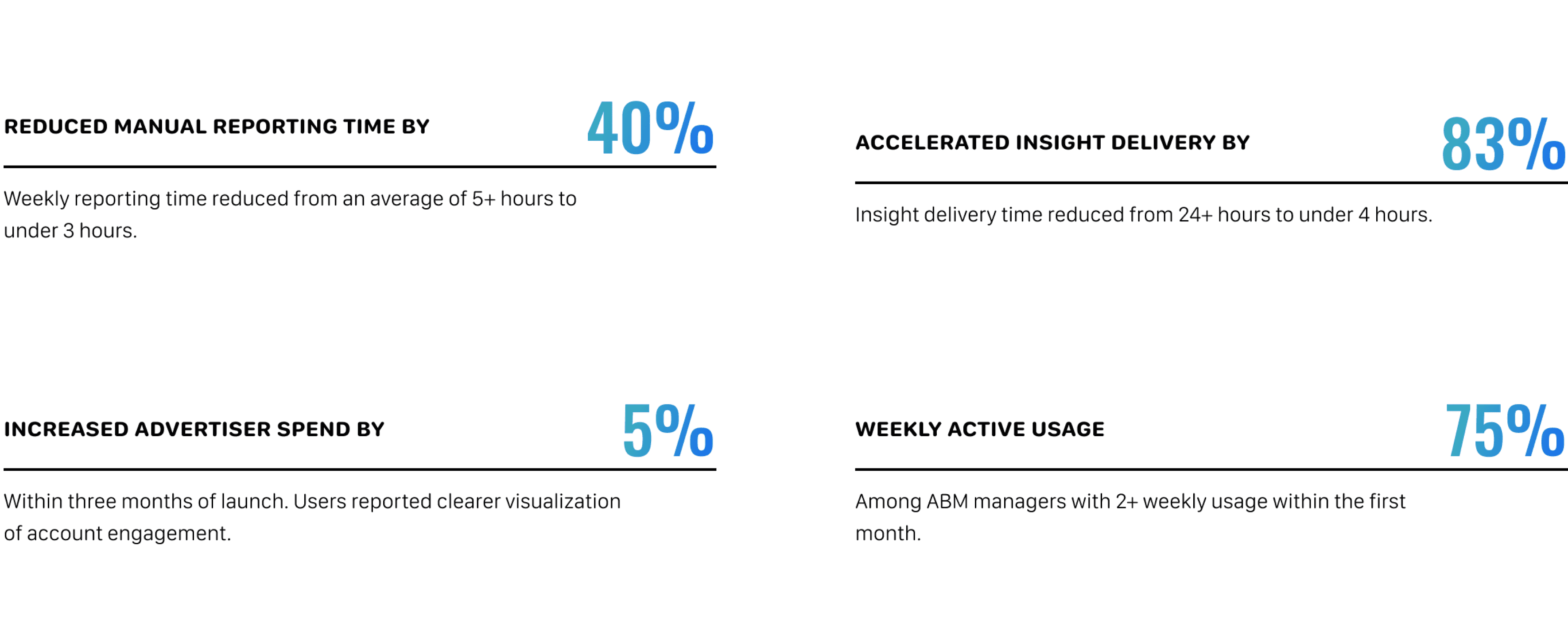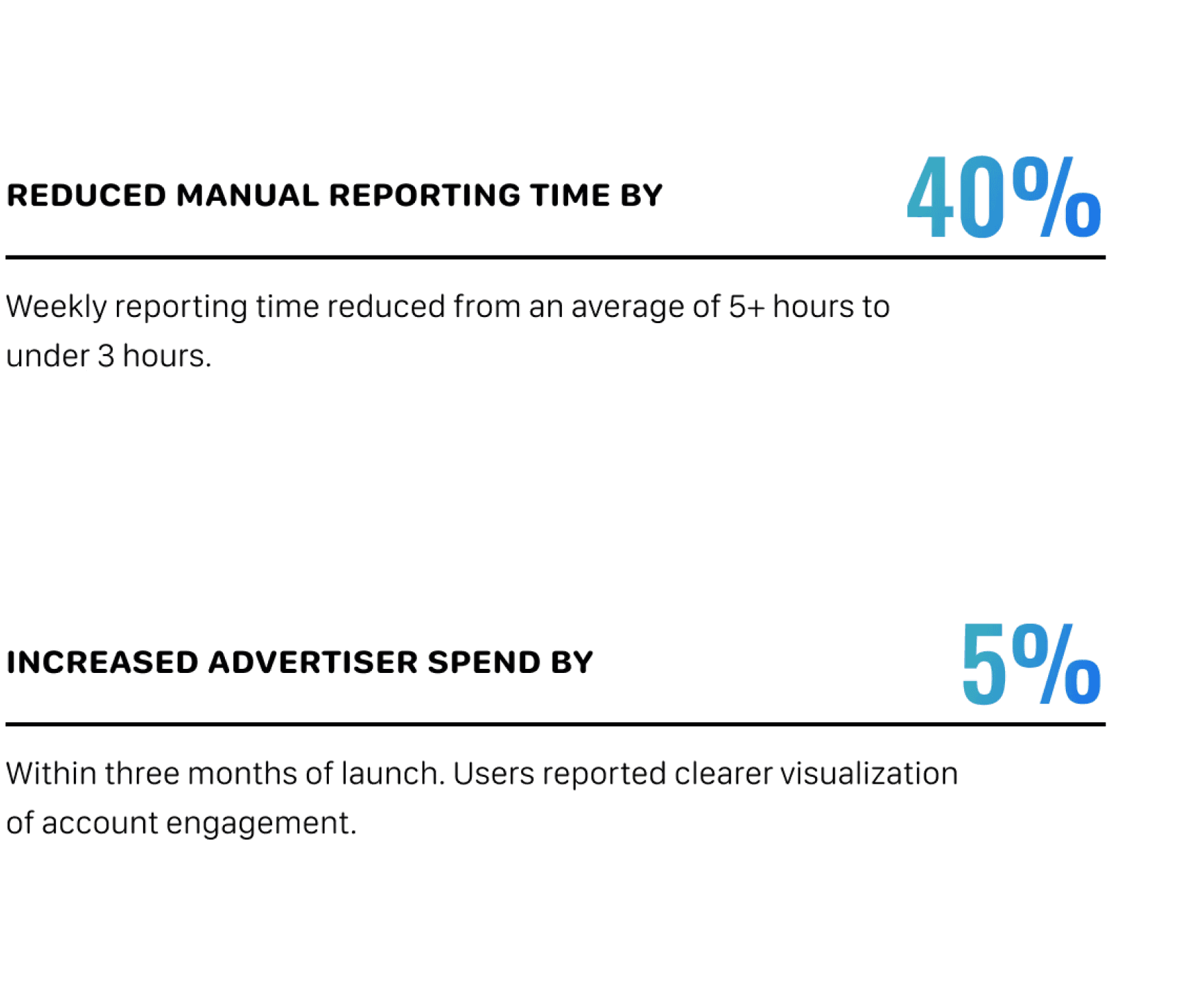 The tool should transform reporting from a time-consuming manual task into a fast, seamless workflow — freeing teams to focus on strategy rather than spreadsheets. It should deliver timely insights that enable confident decisions, strengthen advertiser relationships, and become a natural part of the managers’ weekly routine.