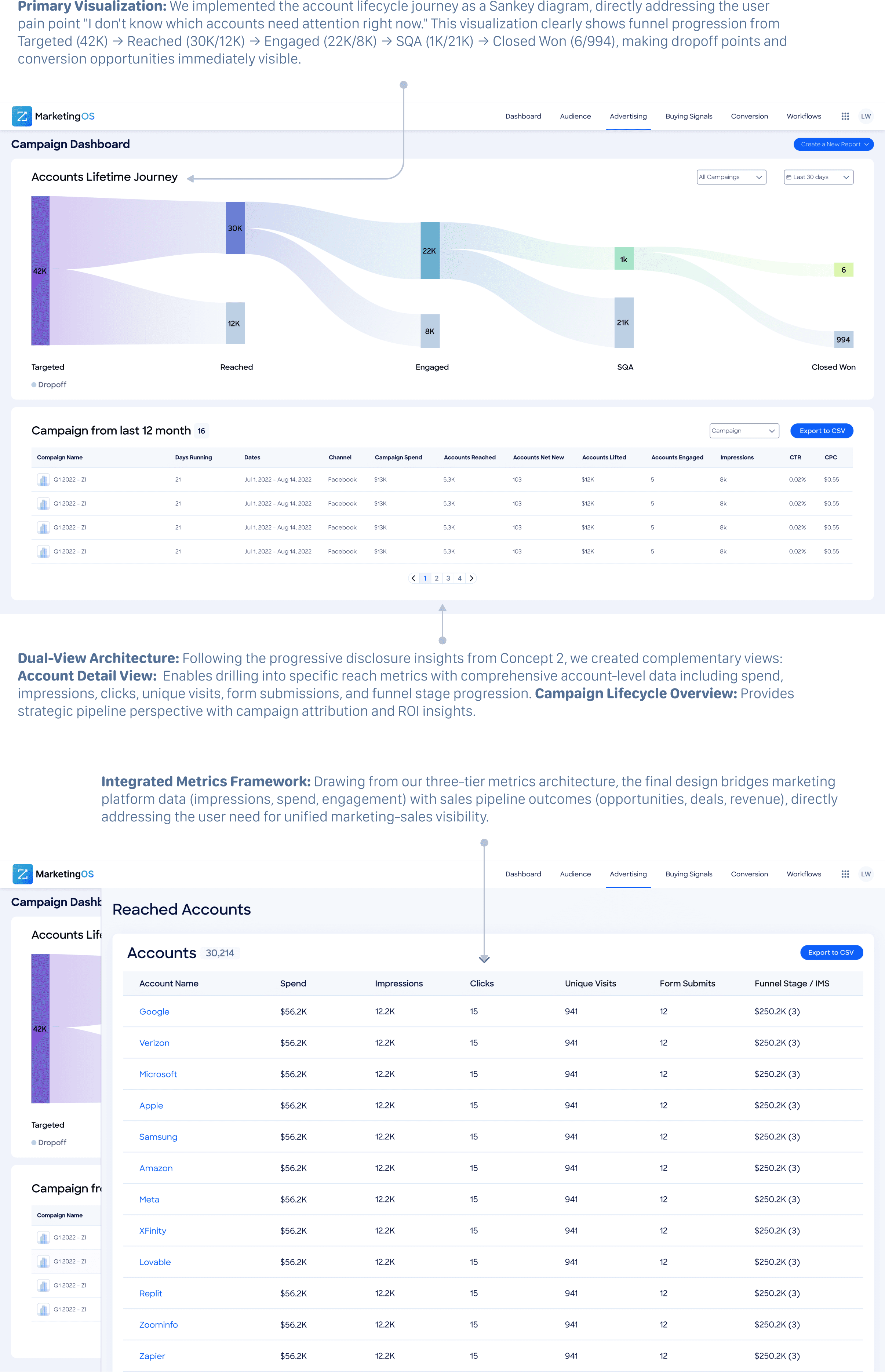 The most significant learning was that users conceptualize their work in terms of account journeys rather than isolated metrics. This validated our decision to prioritize the flow visualization over traditional dashboard layouts, confirming that the Sankey diagram addressed their fundamental mental model for understanding campaign effectiveness.