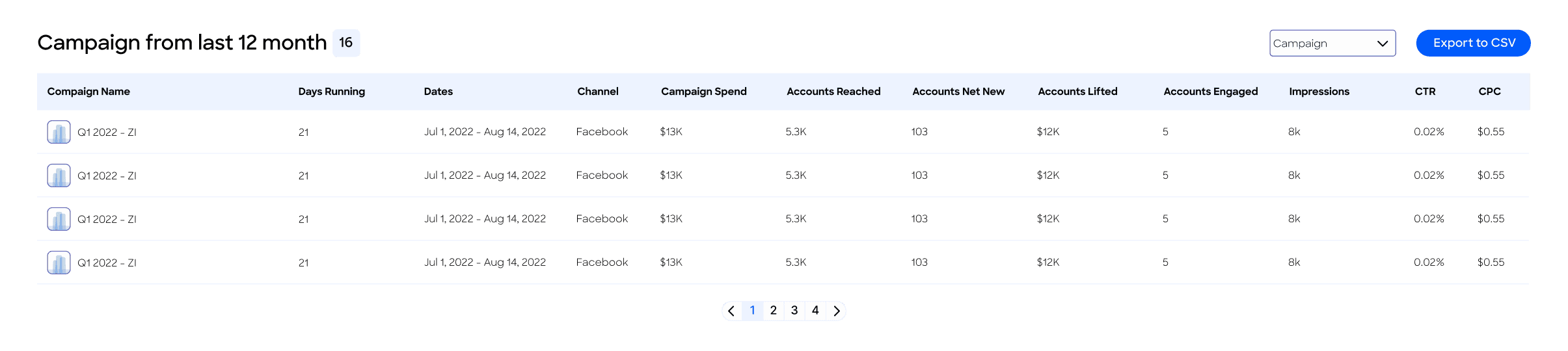 At the bottom of the dashboard, the Campaigns from the past 12 months section provides another view of campaigns for the past 12 months. In this section, user can view metrics per campaign and switch to a monthly view to see a month-by-month breakdown and export the data from this table to a CSV file.