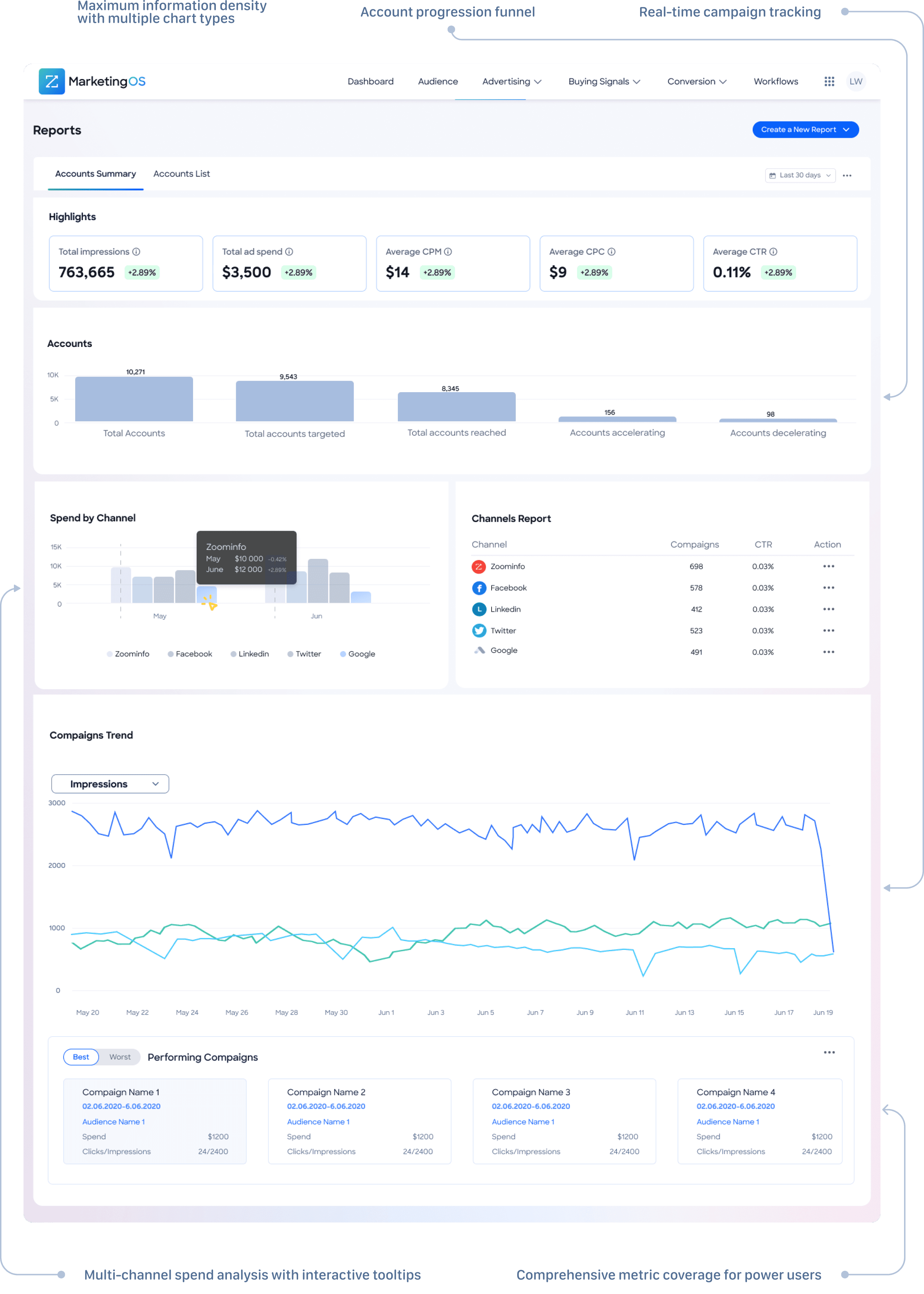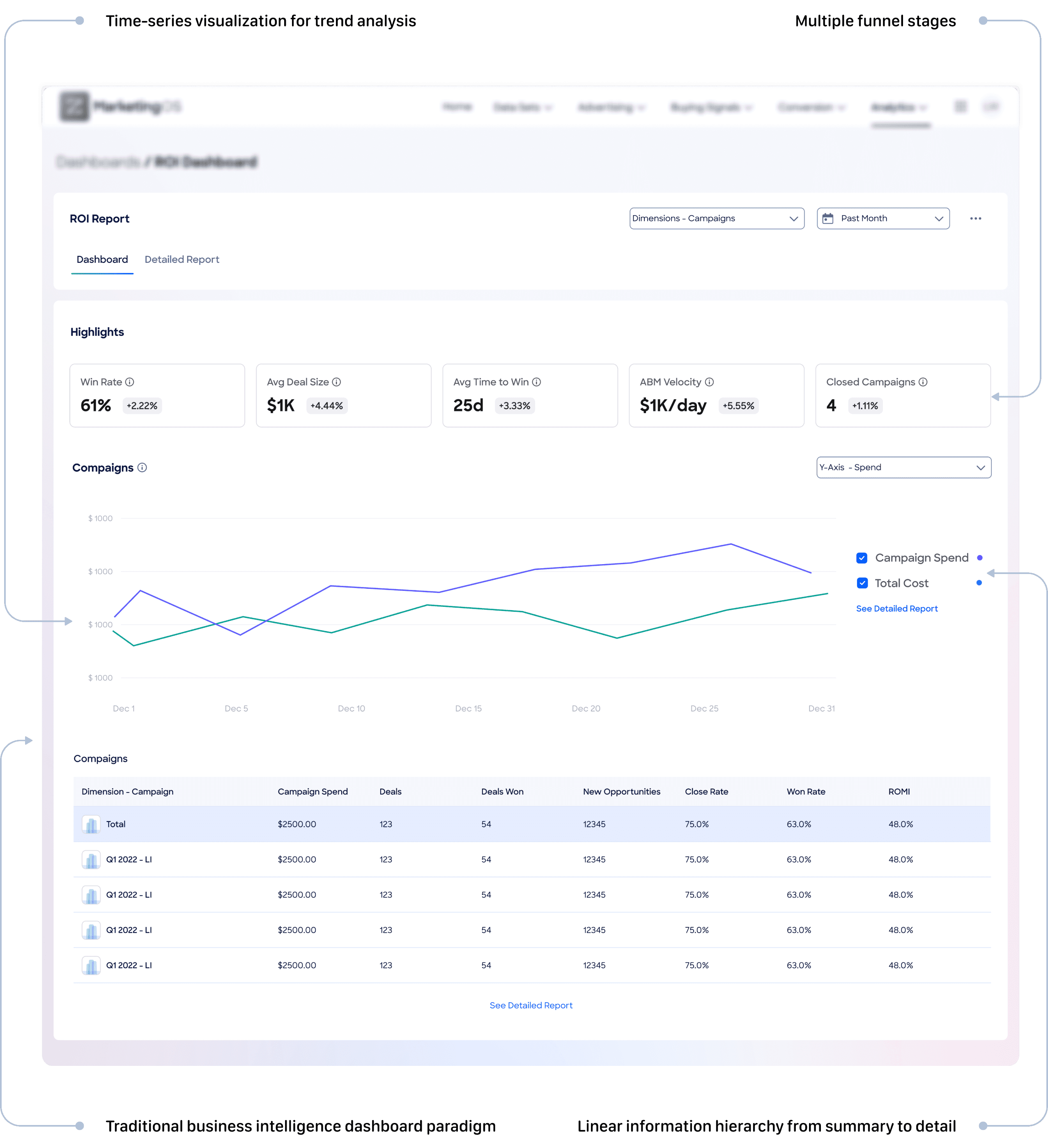 This concept featured highlight cards displaying key performance metrics, followed by timeline-based graphs showing campaign performance trends over time. Below the visual layer, comprehensive data tables provided granular access to detailed metrics.