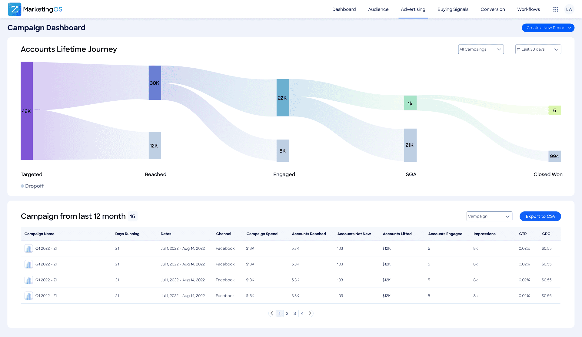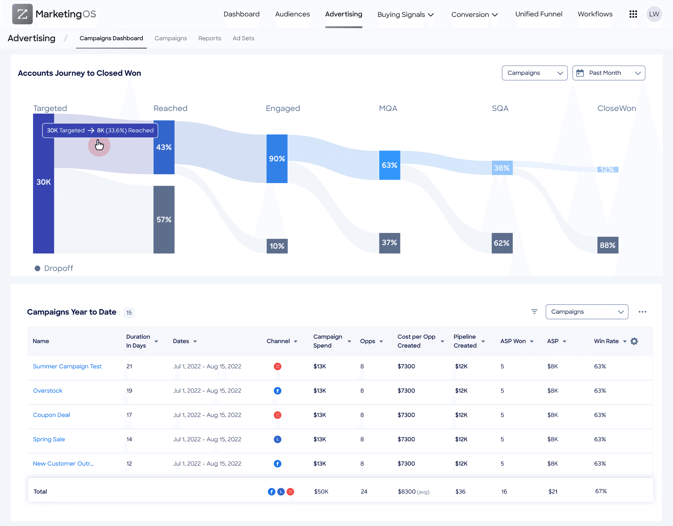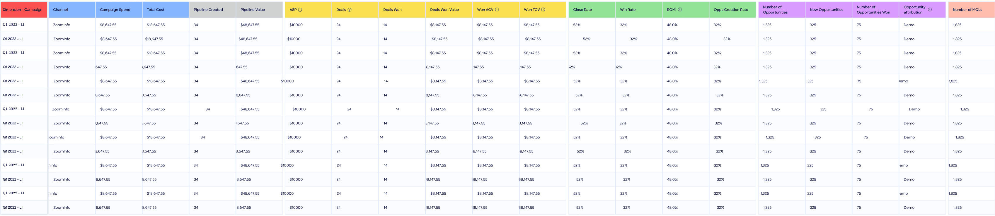 Campaign Lifecycle Overview: Provides strategic pipeline perspective with campaign attribution and ROI insights