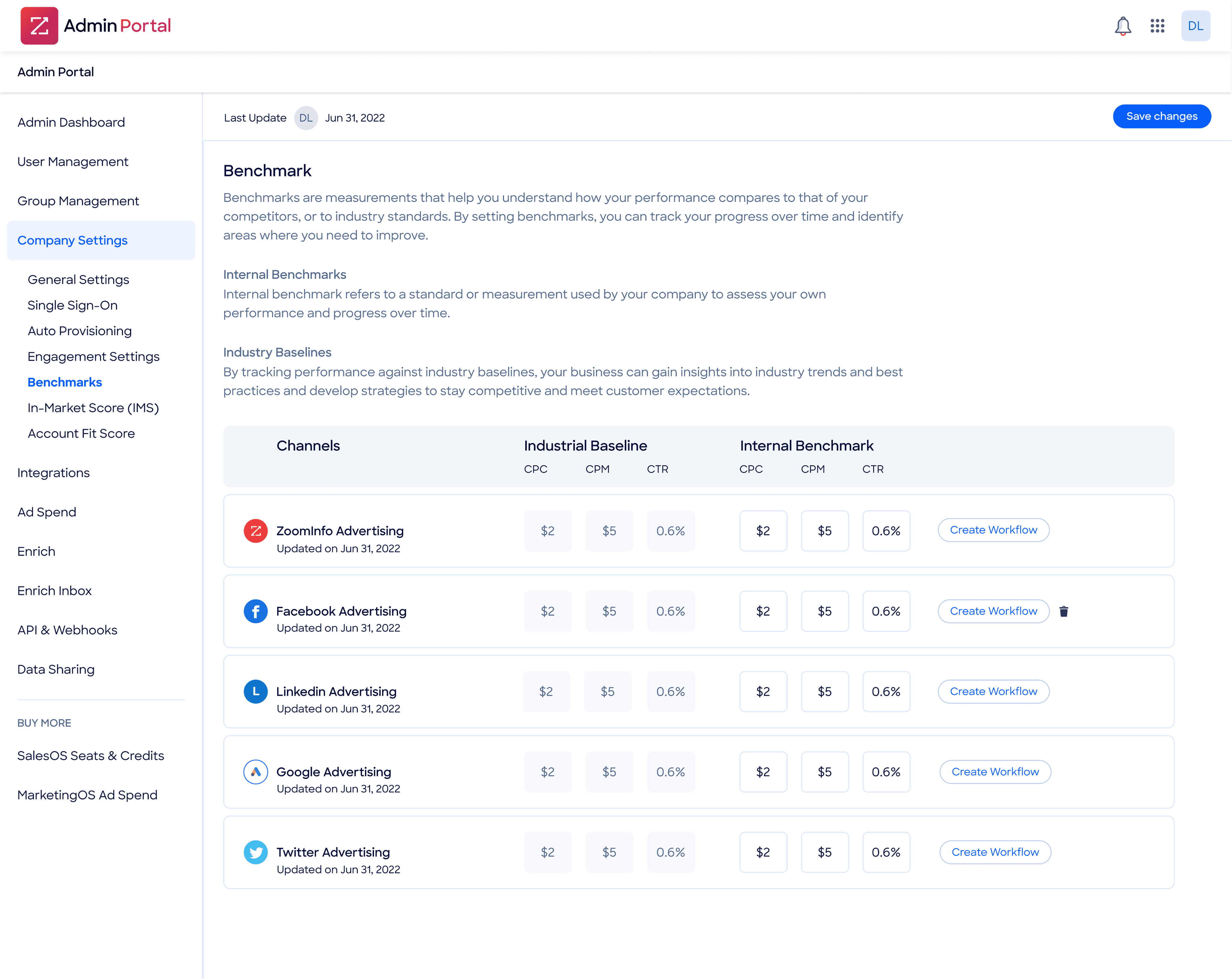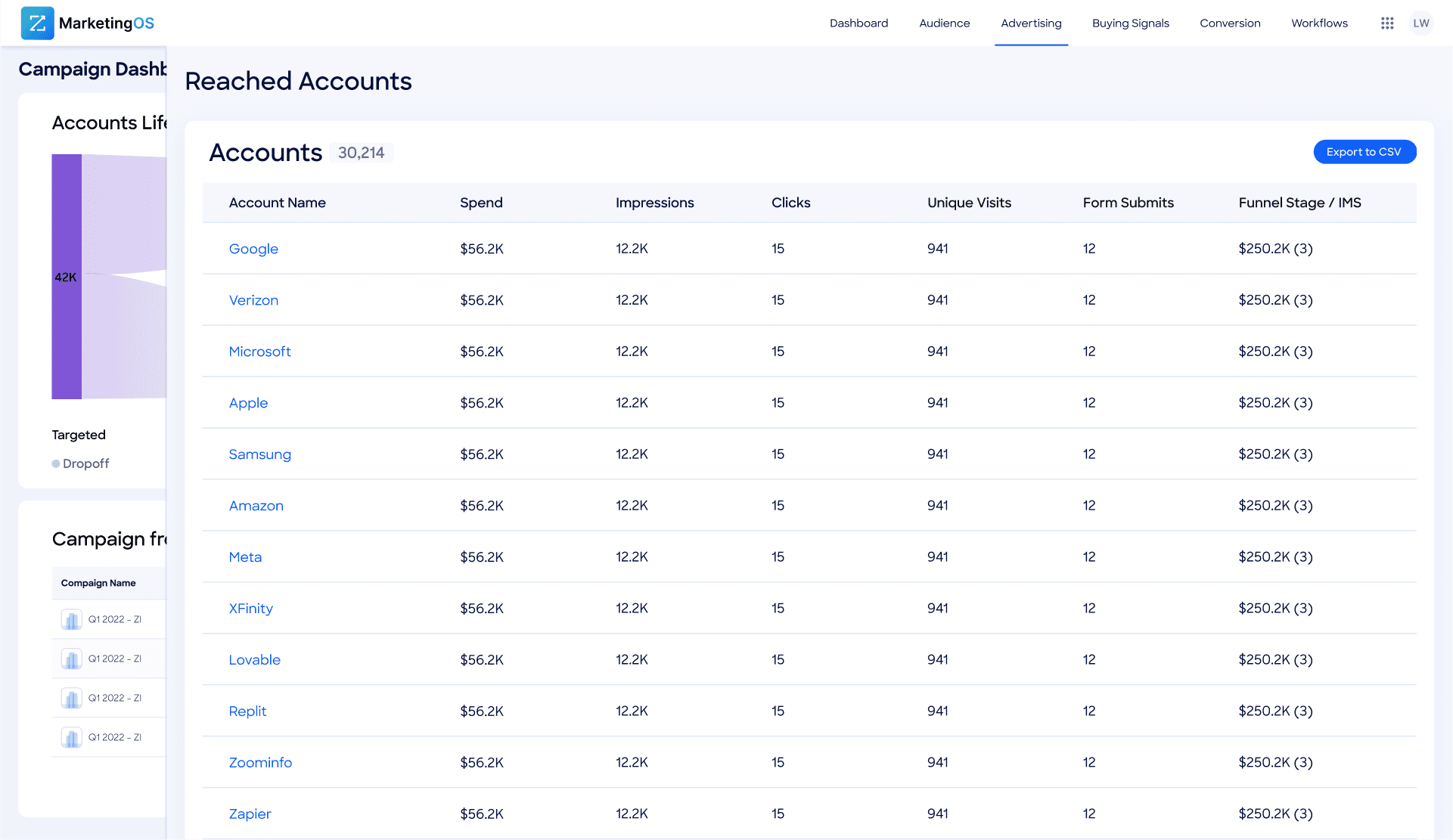 Account Detail View: Enables drilling into specific reach metrics with comprehensive account-level data including spend, impressions, clicks, unique visits, form submissions, and funnel stage progression