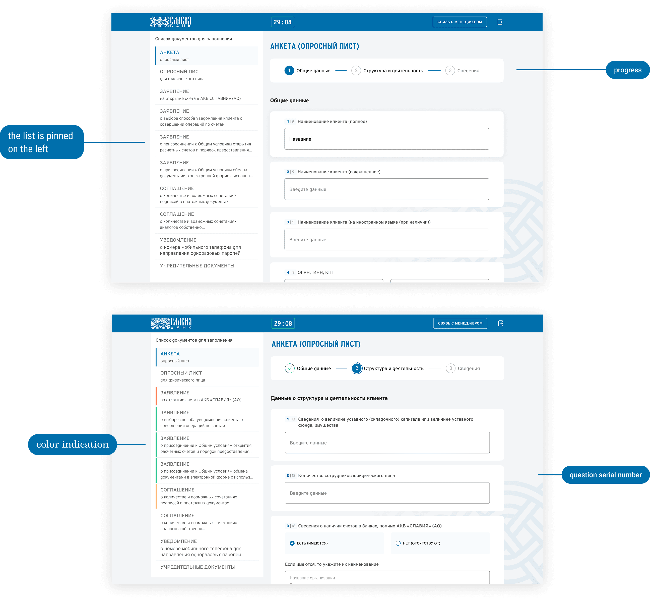 We designed a personal online portal for business clients, covering every step from secure authorization to document submission. The flow was structured into clear stages with progress indicators, smart autofill (via Dadata API), and integrated support. An admin panel allowed bank staff to manage forms, sessions, and user data, ensuring flexibility and scalability.